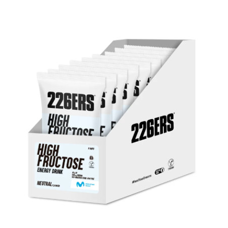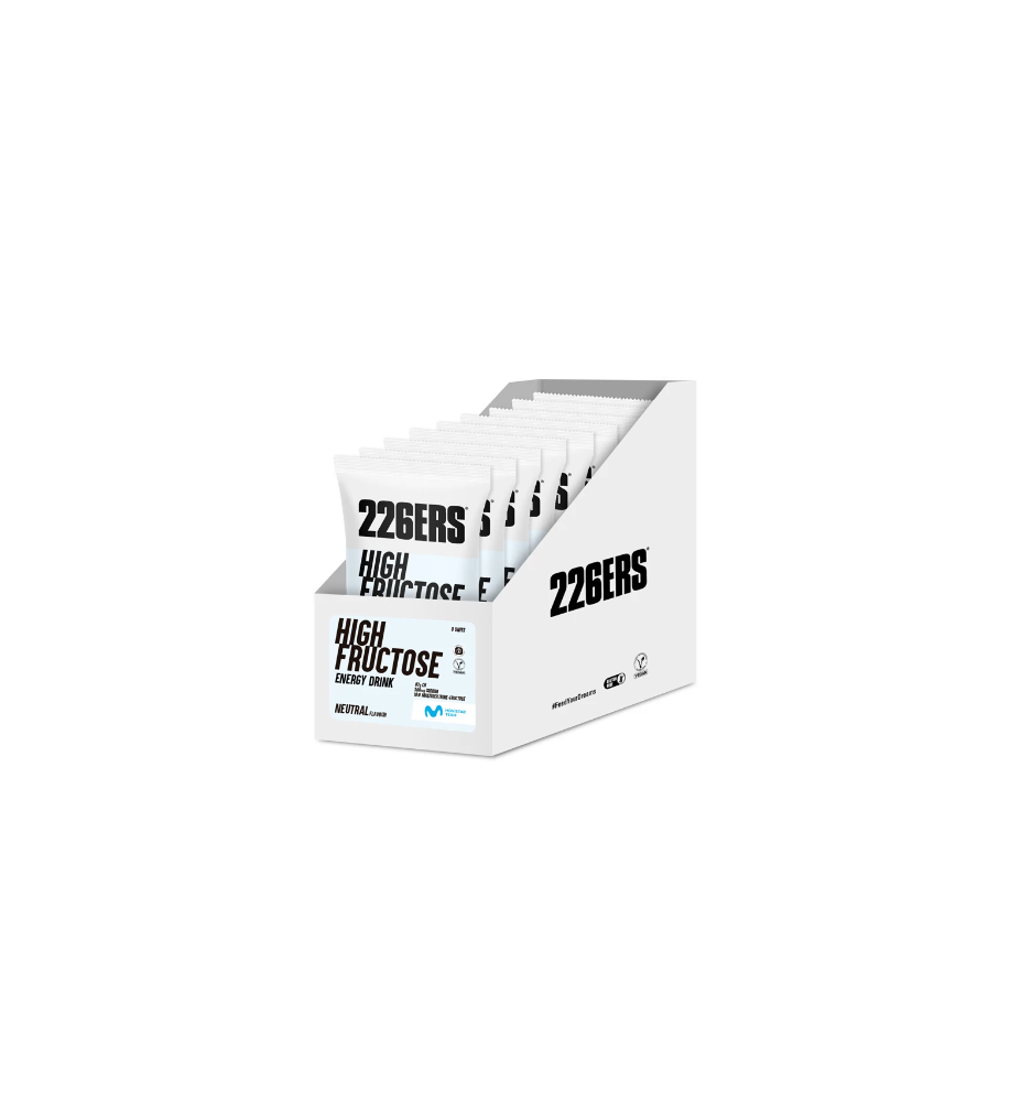 HIGH FRUCTOSE ENERGY DRINK es una bebida formulada con maltodextrina y fructosa, en proporción 10:8, con un aporte de hidratos de carbono de 87g por toma y 347 Kcal. Además de 500 mg de sodio. Es apto para veganos, sin gluten y está disponible en tres sabores.
