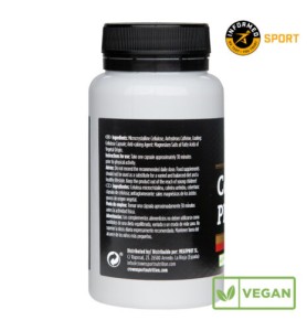 Cápsulas pequeñas de 100 mg de cafeína anhidra con certificación antidoping Informed Sport. Sin alérgenos y vegan.